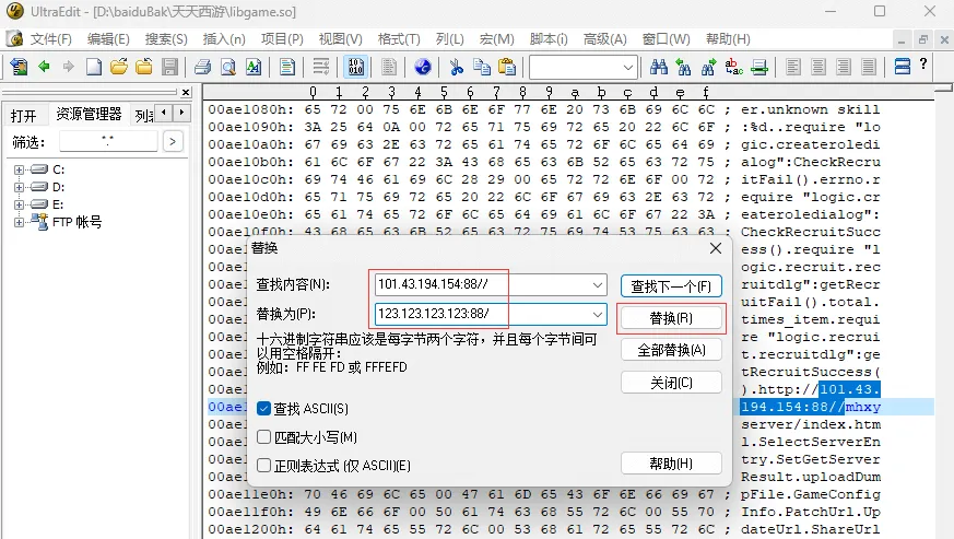 点击工具菜单搜索 - 替换,记得勾选查找 ASCII,查找 101.43.194.154:88//,替换为你的 IP,注意要对位,保持位数一致 19 位。比如你的 IP 是 11.22.123.44,那么就需要补 / 改为 11.22.123.44:88//// 达到 19 位。如果你的 IP 是15位,如 123.123.123.123 那么就需要去掉 / 改为 123.123.123.123:88/ 达到 19 位。