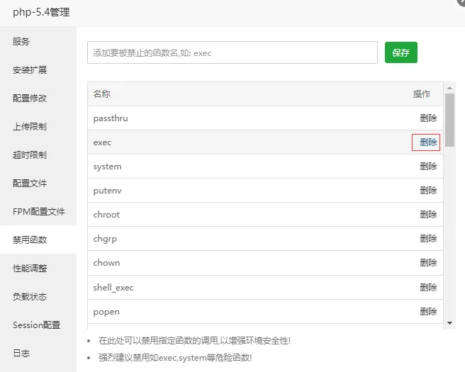 需要注意的是 PHP 需要将禁用函数 exec 删除,然后将 PHP 重载配置再重启。