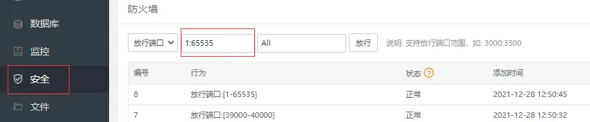 然后在宝塔菜单安全中开放所有端口。