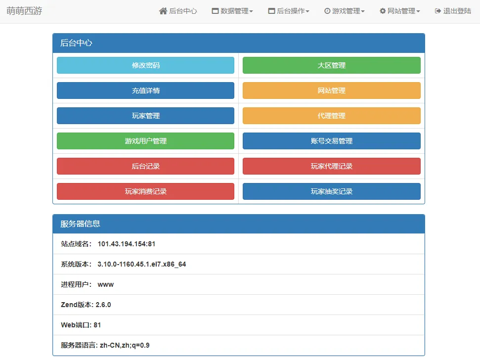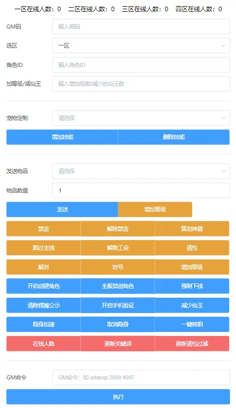 游戏 GM 后台链接:http://ip:81/gm/gm/gm.php,默认 GM 码:123456,如果想修改 GM 码需要修改文件 /www/wwwroot/81/gm/gm/conn.php 中的 $gmpwd 字段值即可。