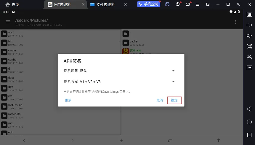 更新完后,回到 /sdcard/Pictures/ 目录下,长按 APK,选择签名。