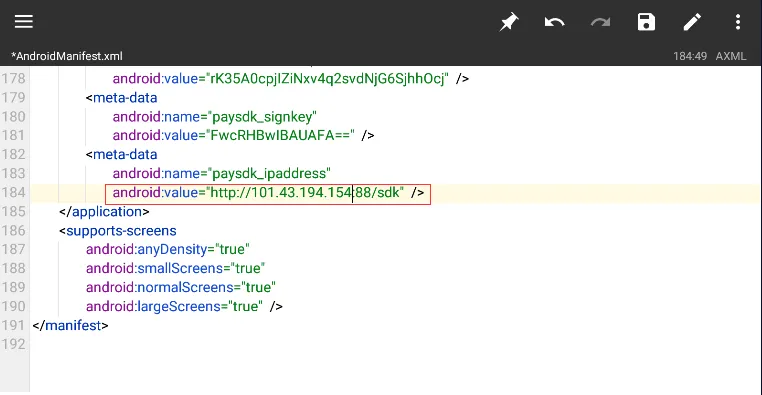 找到 AndroidManifest.xml 文件,点击选择反编译打开,找到 IP 101.43.194.154 替换为你的 IP,保存后返回。提示在压缩文件中更新该文件,选择确定。