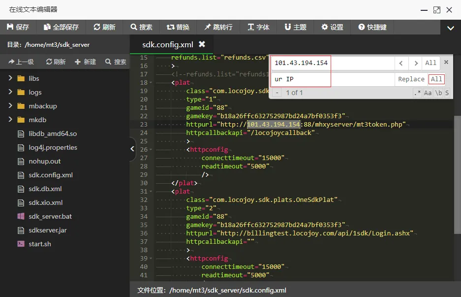 以第一个 sdk.config.xml 文件为例,在宝塔中找到文件,双击修改,Ctrl+F 批量替换 IP。