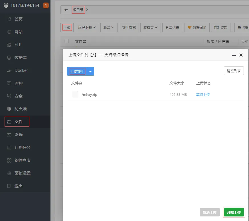 拿到源码后,将 mhxy.zip 压缩文件通过宝塔上传到根目录(如果宝塔禁止上传到根目录,可上传其他路径后剪切粘贴到根目录)。
