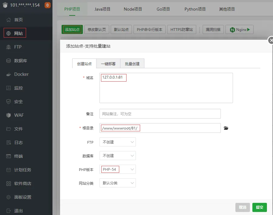 域名为 127.0.0.1:81,根目录为 /www/wwwroot/81,PHP 选择 5.4 版本。