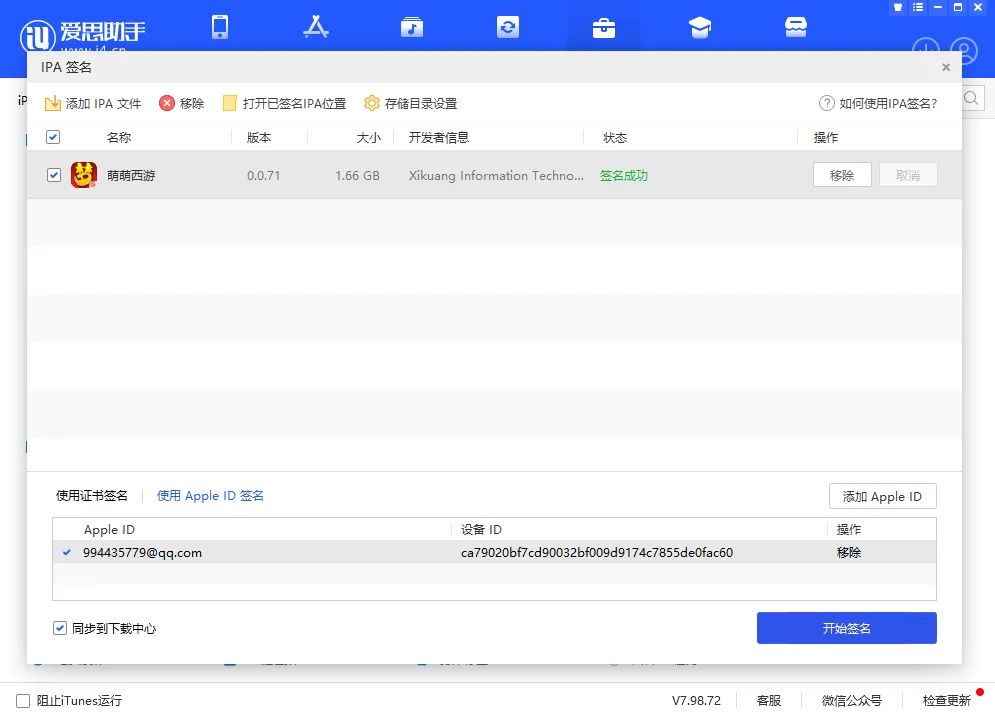 修改好后我们需要借助爱思助手签名,签名后就可以成功安装到自己的苹果手机中,需要在手机设置 - 通用 - 设备管理中信任该软件才可启动。