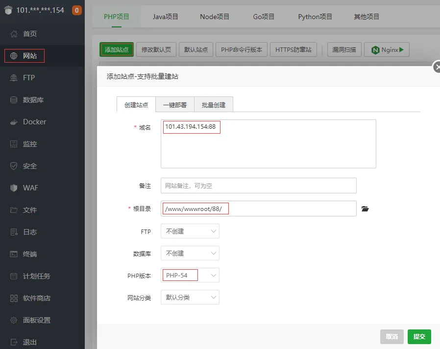 域名为 IP:88,根目录为 /www/wwwroot/88,PHP 选择 5.4 版本。