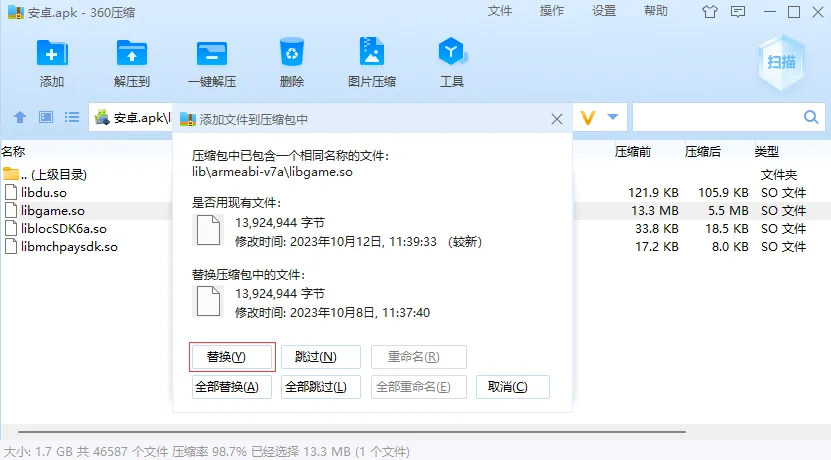 第一个文件需要反编译修改,我们先修改第二个文件,用 360 压缩软件打开APK文件,找到 \lib\armeabi-v7a\libgame.so 拖出来。使用资源中的 UE 中文版编辑器打开 libgame.so。