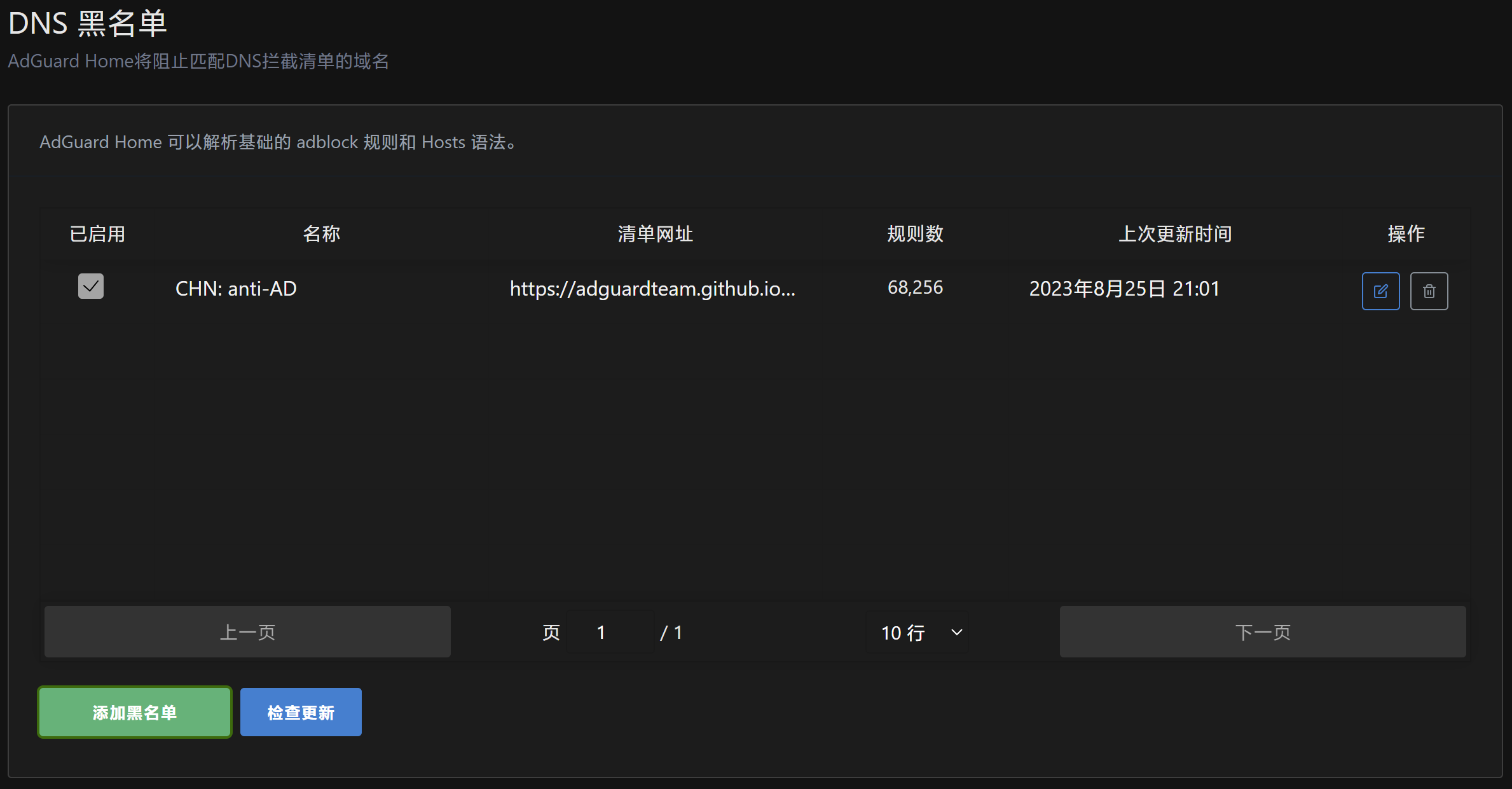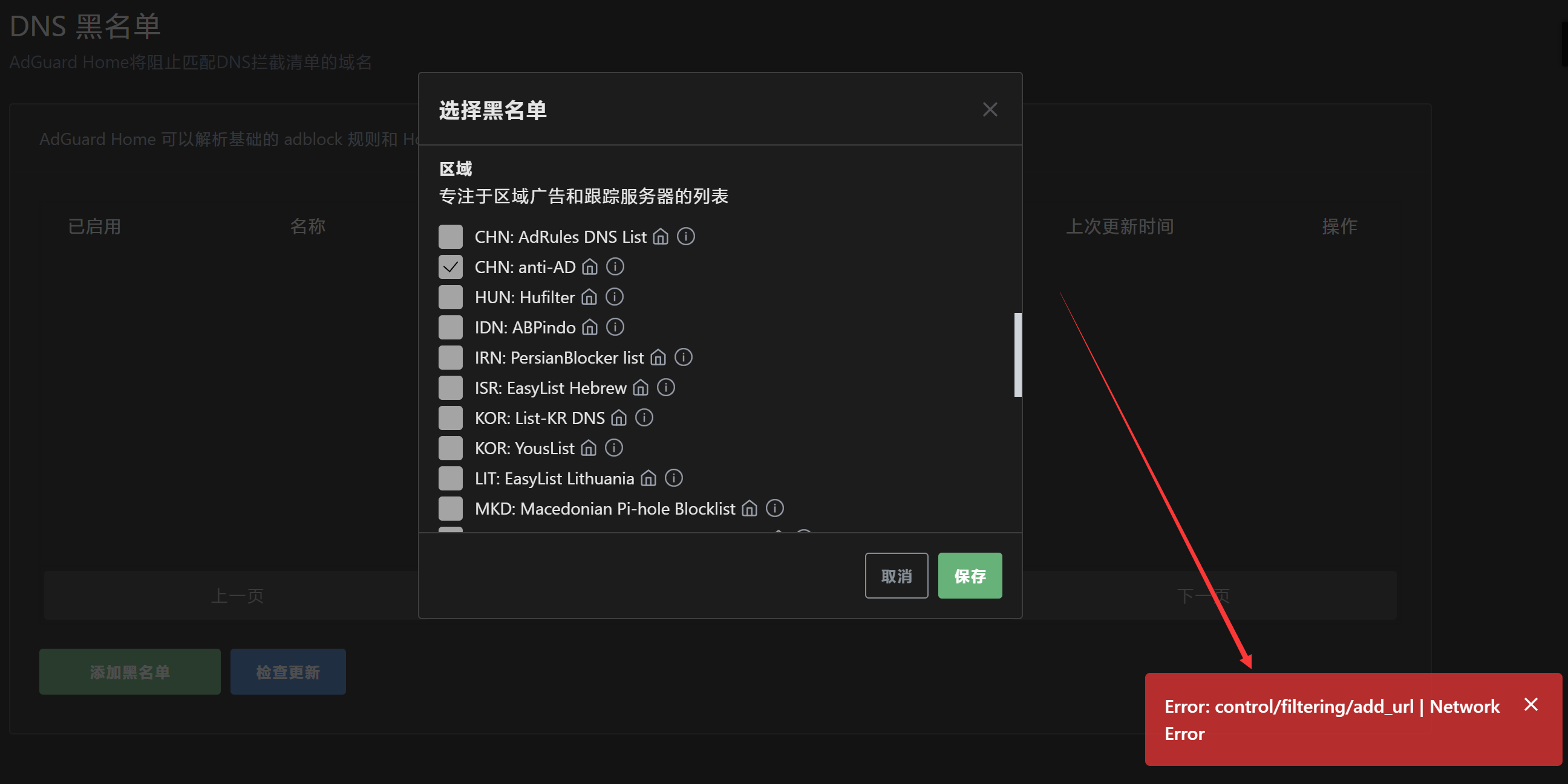 ⑤ 进入过滤器->DNS 黑名单->添加黑名单->从列表中选择,推荐勾选“区域”里的“CHN: anti-AD”,然后点击“保存”