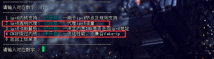 ⑤ 进入主菜单-> 7 内核进阶设置-> 1 ipv6 相关,若机场节点支持 IPv6,可开启 2 ipv6 透明代理;根据自身需要开启 4 CNIP 绕过内核