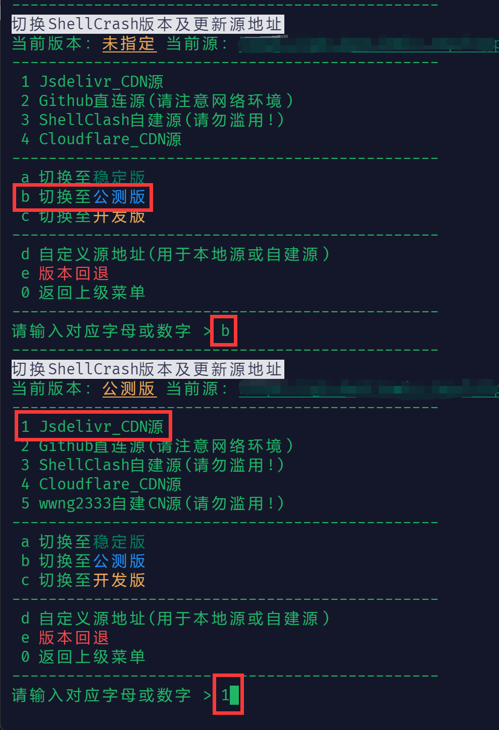 ⑥ 进入主菜单-> 9 更新/卸载-> 7 切换安装源及安装版本,选择 b 切换至公测版->1 Jsdelivr_CDN源,追求新版可选择 c 切换至开发版(可能不稳定)