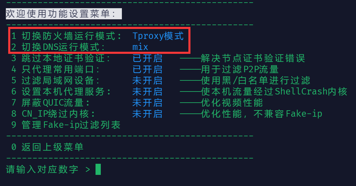③ 进入主菜单-> 2 内核功能设置-> 1 切换 Clash 运行模式,选择 5 Tproxy 模式